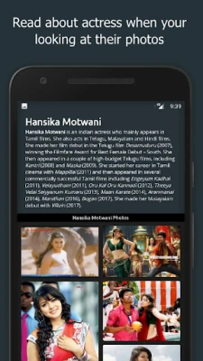 Some of the popular actress pictures which are included in our app are Nazriya Nazim, Nithya Menen, Kavya Madhavan, Meera Jasmine, Manju Warrier, Bhavana, Nayanthara, Shwetha Menon, Namitha Pramod, Mamta Mohandas, Keerthi Suresh, Remya Nambeesan, Lakshmi Rai, Samvritha Akhil, Rima Kallingal, Parvathy Menon, Amala Paul, Gopika, Isha Talwar, Miya, Asha Sharath, Sai Pallavi, Navya Nair, Madonna Sebastian, Asin, Meghana Raj, Anupama Parameshwaran, Ananya, Honey Rose, Niveda Thomas, Priyamani, Malavika Menon, Archana Kavi, Jyothirmayi, Nikki Galrani, Swathi Reddy, Nikhila Vimal and so many. Athiya Shetty, Amyra Dastur, Aditi Rao Hydari, Bhumi Pednekar, Disha Patani, Elli Avram, Fatima Sana Shaikh, Ishita Dutta, Kiara Advani, Kriti Kharbanda, Kriti Sanon, Nora Fatehi, Nushrat Bharucha, Pooja Hegde, Rhea Chakraborty, Suhana khan, Taapsee Pannu, Urvashi Rautela, Vaani Kapoor, Yami Gautam, Adah Sharma, Alia Bhatt, Amy Jackson, Anushka Sharma, Chitrangada Singh, Deepika Padukone, Diana Penty, Esha Gupta, Gauhar Khan, Genelia D`Souza, Huma Qureshi, Ileana D`Cruz, Jacqueline Fernandez, Kajal Aggarwal, Kangana Ranaut, Katrina Kaif, Mahi Gill, Nargis Fakhri, Neha Sharma, Poonam Pandey, Radhika Apte, Sana Khan, Shraddha Kapoor, Sonakshi Sinha, Sunny Leone, Tamannaah Bhatia, Zareen Khan.