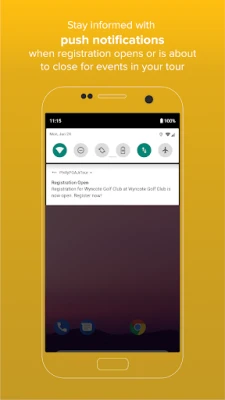 - Golfers can join or connect using their Golf Genius credentials. - Golfers can review the events schedule and quickly register for events. - Golfers can view important event information such as the event pairings and tournament results. - Push notifications alert golfers when registration opens or is about to close for tour events.